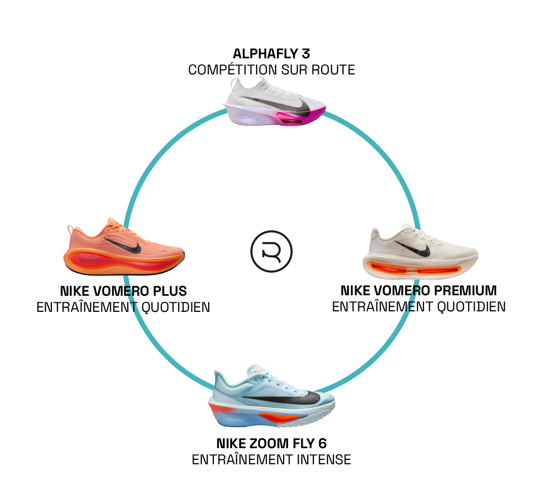 Nike Alphafly 3 (compétition sur route) - Nike Vomero Premium (entraînement quotidien) - Nike Vomero Plus (entraînement quotidien) - Nike Zoom Fly 6 (entraînement intense)